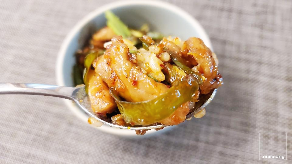 약간 양념치킨의 맛이 나면서 싼 돼지고기 뒷다리살로