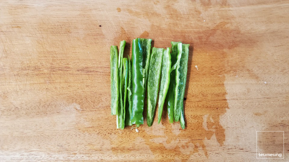 청양고추는 세로로 썰어서 고추씨를 다 빼 줍니다.