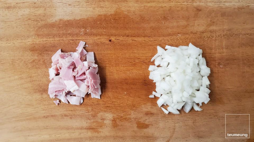 양파와 베이컨 세장을 잘 다져줍니다.