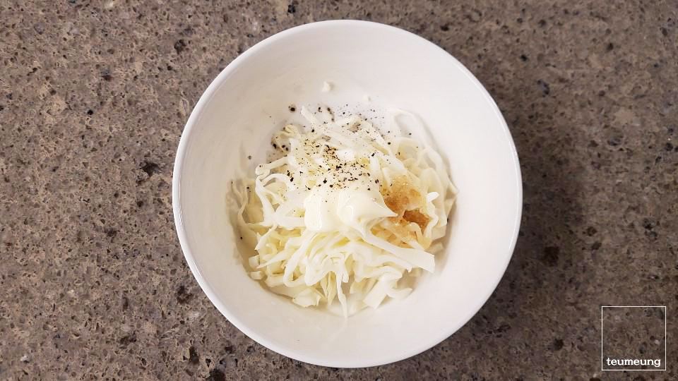 먼저 양배추를 얇게 썰고 씻어서 물기를 빼서 준비해주세요.