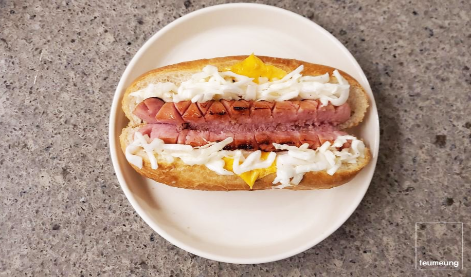 핫도그 양옆에 만들어둔 양배추를 넣어줍니다.