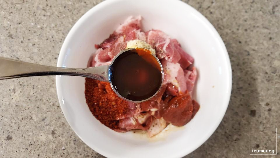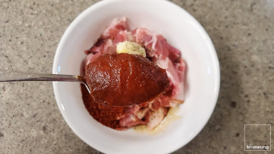 고추장 한 숟가락 반. (양이 더 많다면 모든 양념 두 숟갈 넣어서 만들어 주세요.)