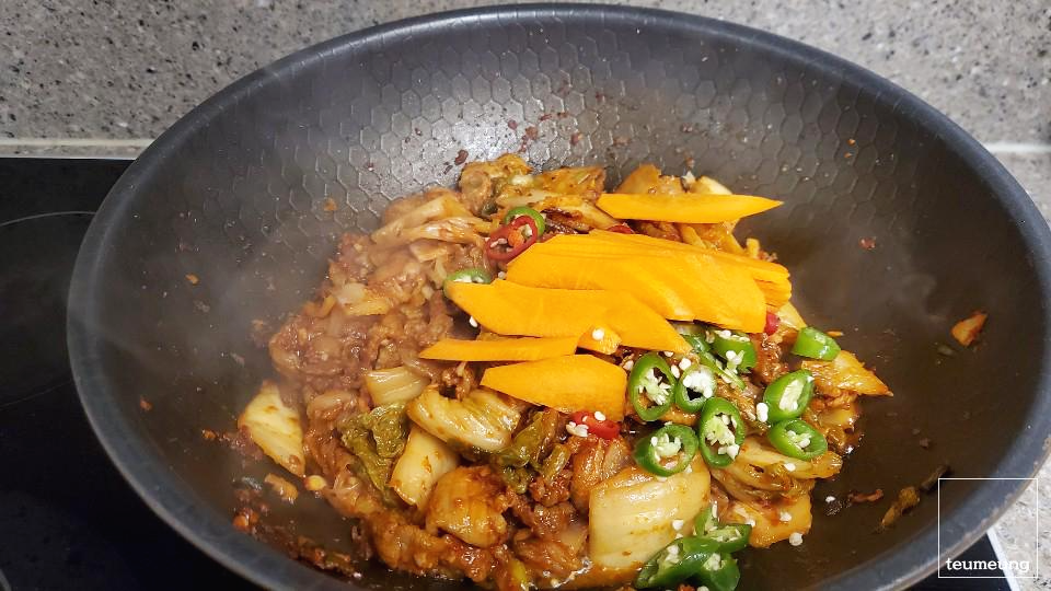 마지막으로 준비해둔 당근과 청양고추를 넣고 볶아줍니다.