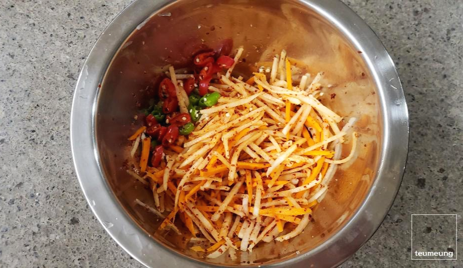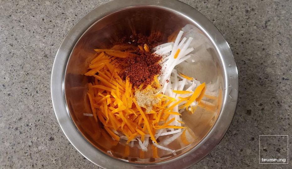 채 썰어둔 무와 당근에 고춧가루 두 스푼과