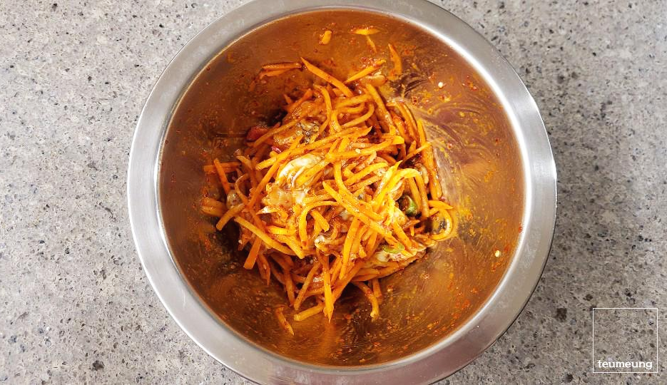 힘을 줘서 팍팍 무쳐주면 무와 당근에서 나오는 수분으로 촉촉한 무침이 되더라고요.