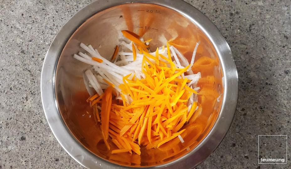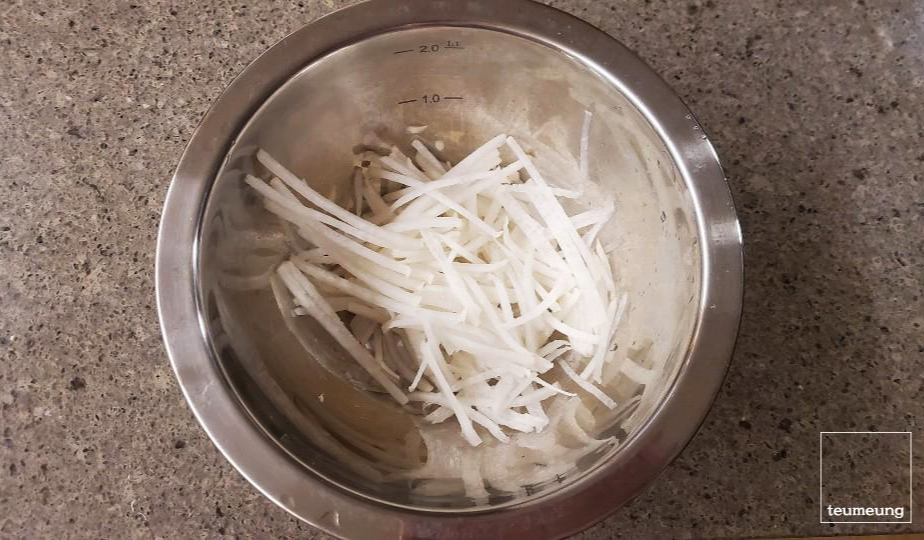무와 당근을 잘게 채를 썰어서 준비해주세요.