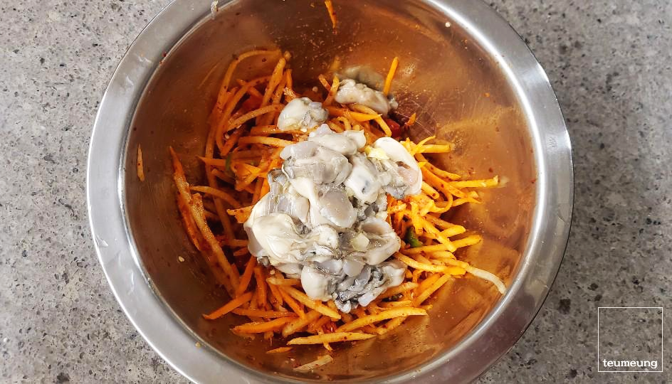깨끗이 씻어둔 굴무침에 양념을 해줄게요.