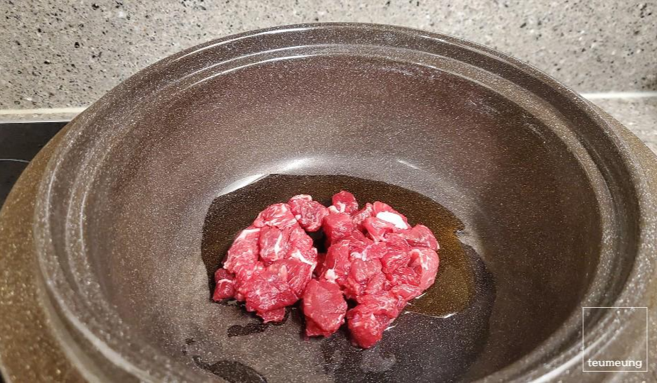 먼저 참기름 두 스푼을 넣고 소고기를 볶아주세요.