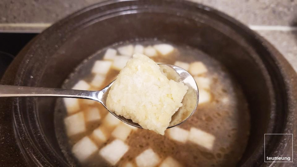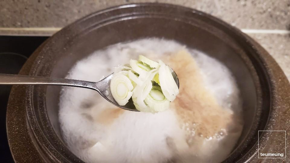 무국에는 두부를 추가해도 좋아요. 저는 고기와 무만 넣어서 푹 끓였습니다.
