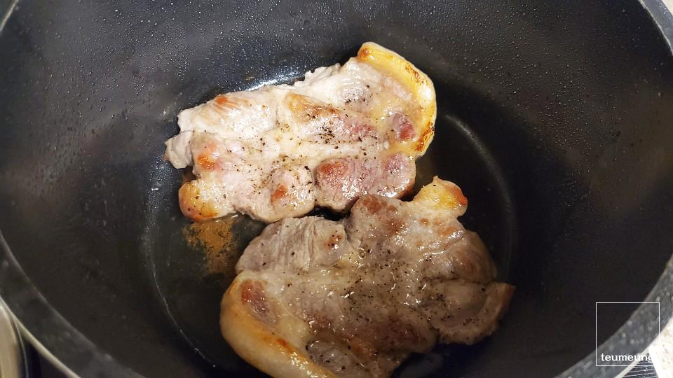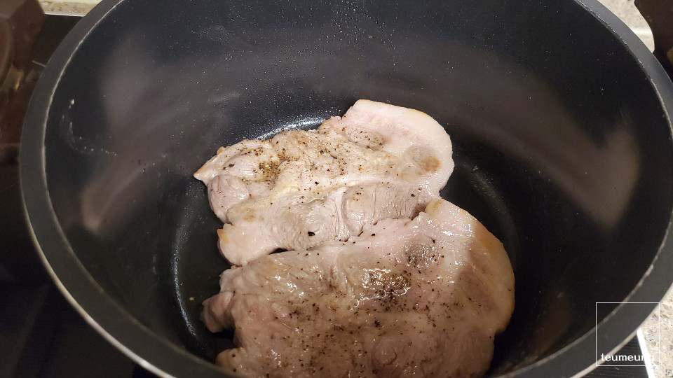 식용유와 버터를 두르고 목살을 튀기듯 구워줘야 됩니다.