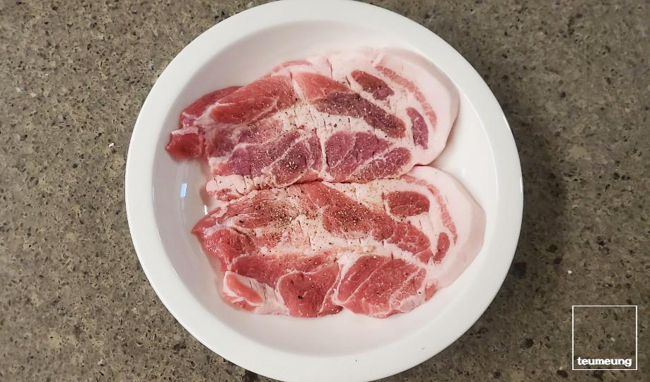 먼저 돼지 목살에 있는 힘줄을 끊듯이 칼집을 내주세요.
