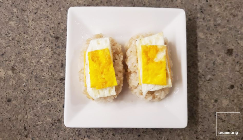 주먹밥 위에 치즈를 먼저 올려줍니다.