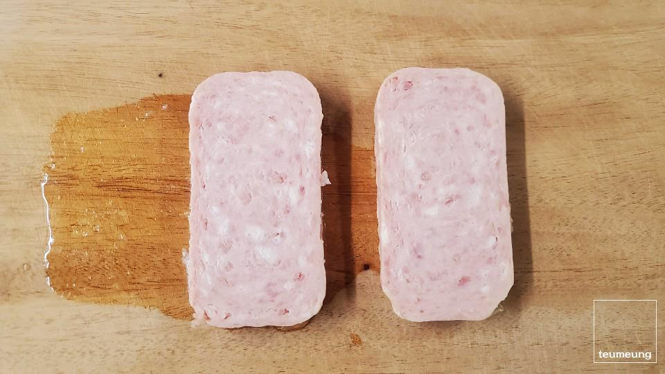 햄을 통째로 꺼내서 너무 얇지도 두껍지도 않게 잘라줍니다.