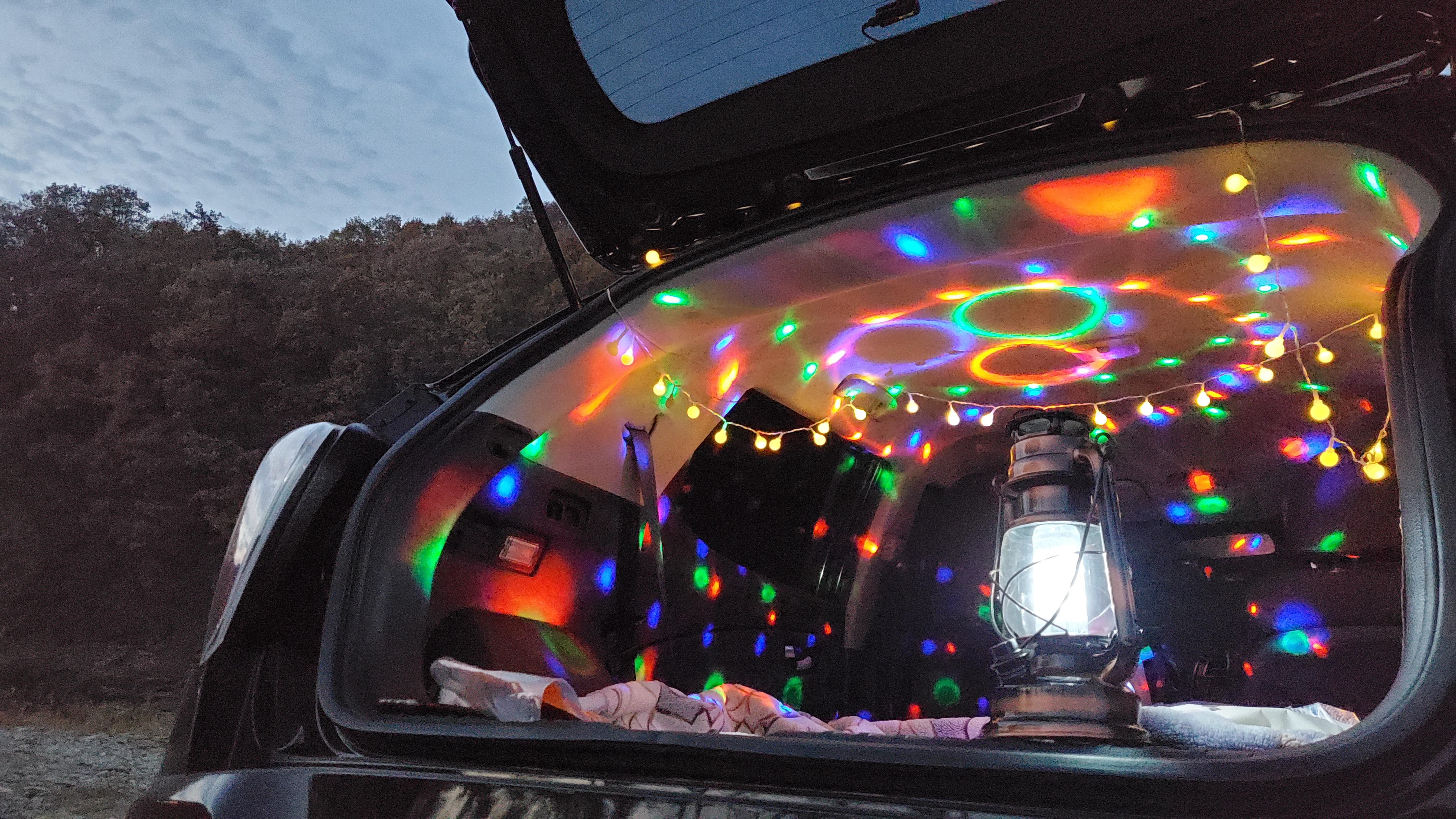 자리를 잡고 매트깔고 이불깔고 조명달고 끝 !