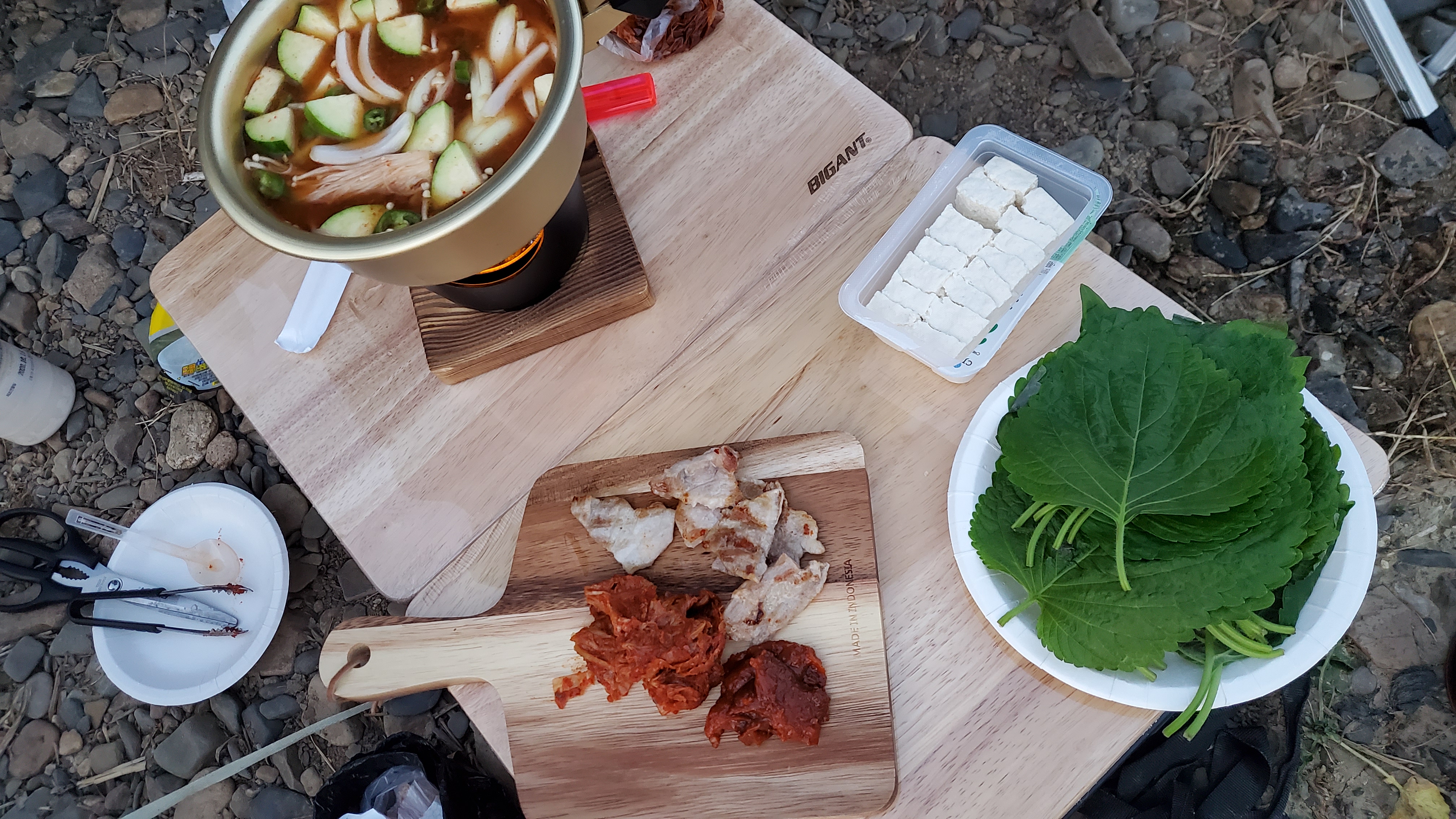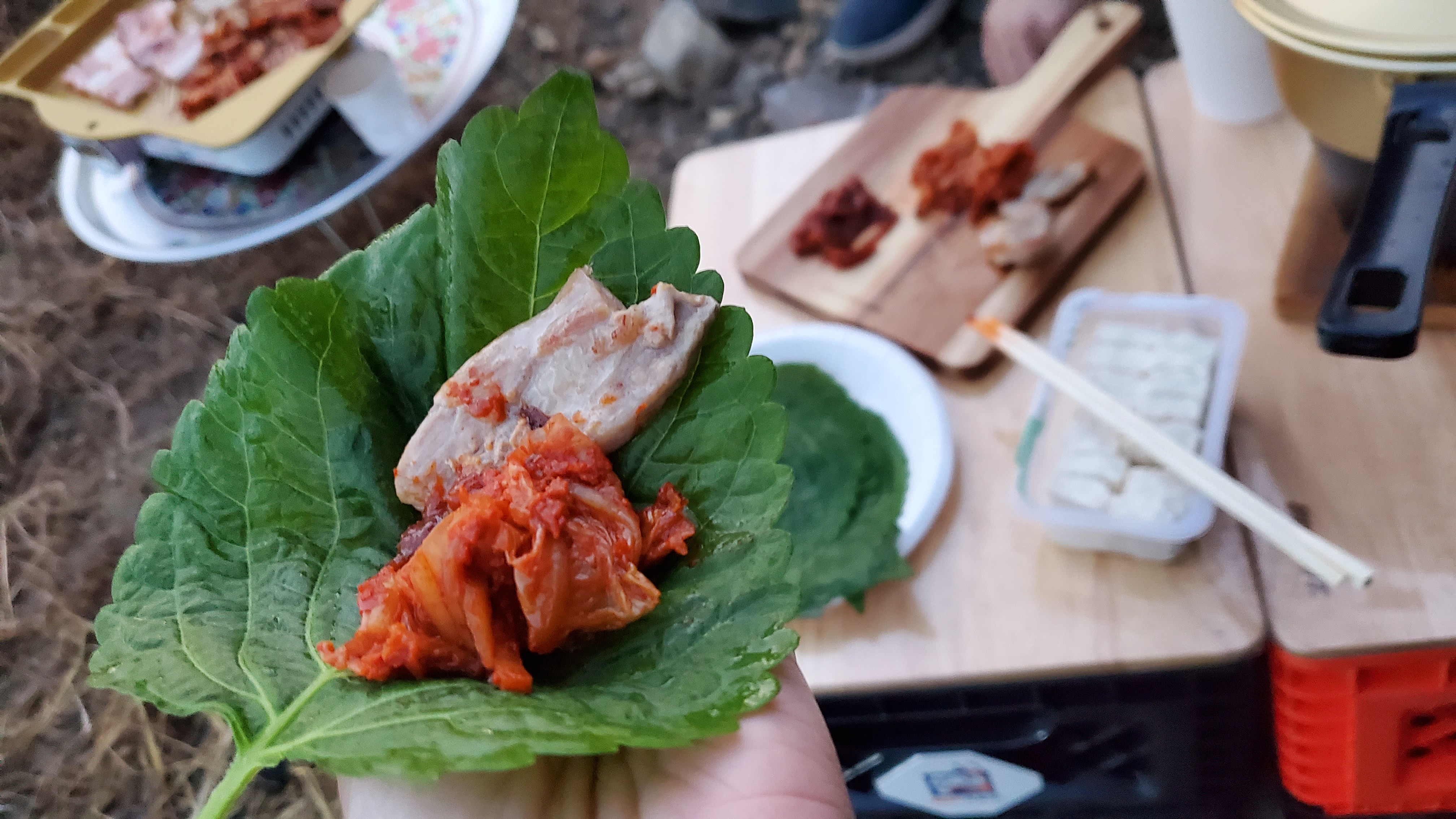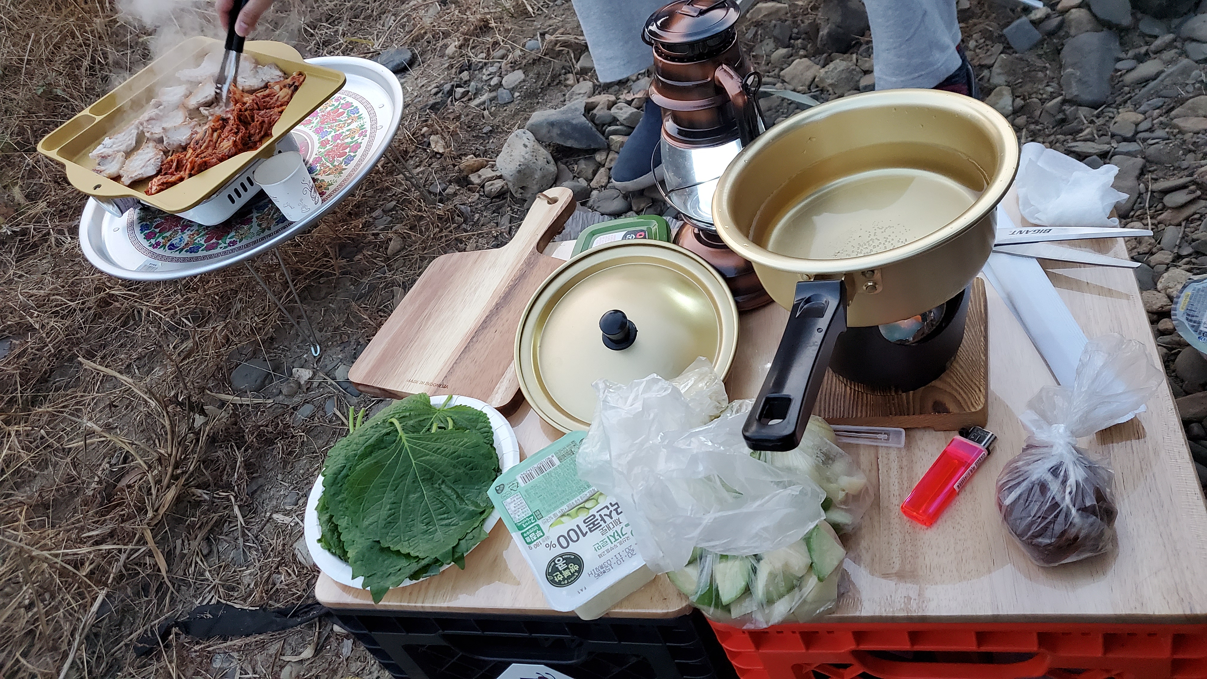 김치와 깻잎, 된장찌개 재료는 집에서 준비해왔습니다