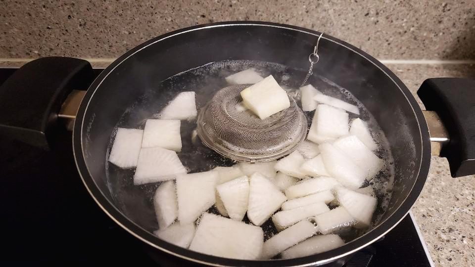 무를 나박나박 썰어주거나 어슷 썰어서 준비해주세요.