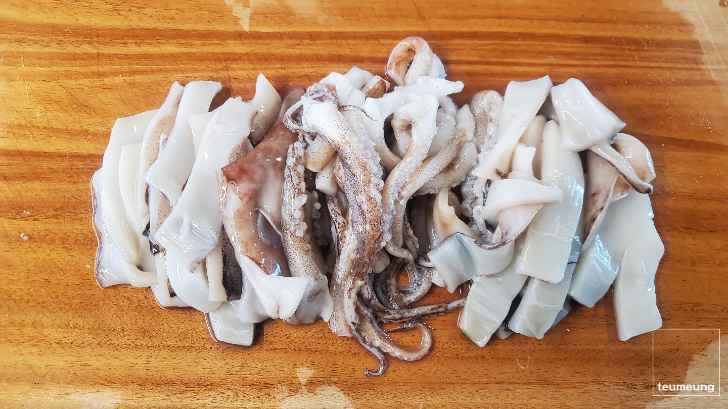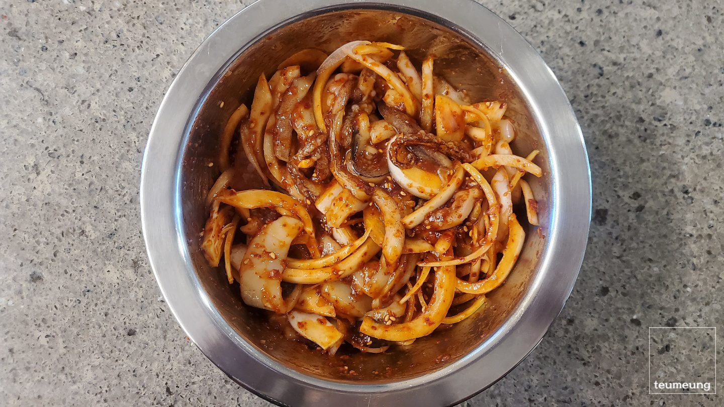 오징어와 양파 그리고 양념을 넣어서 잘 버무려 주세요~!