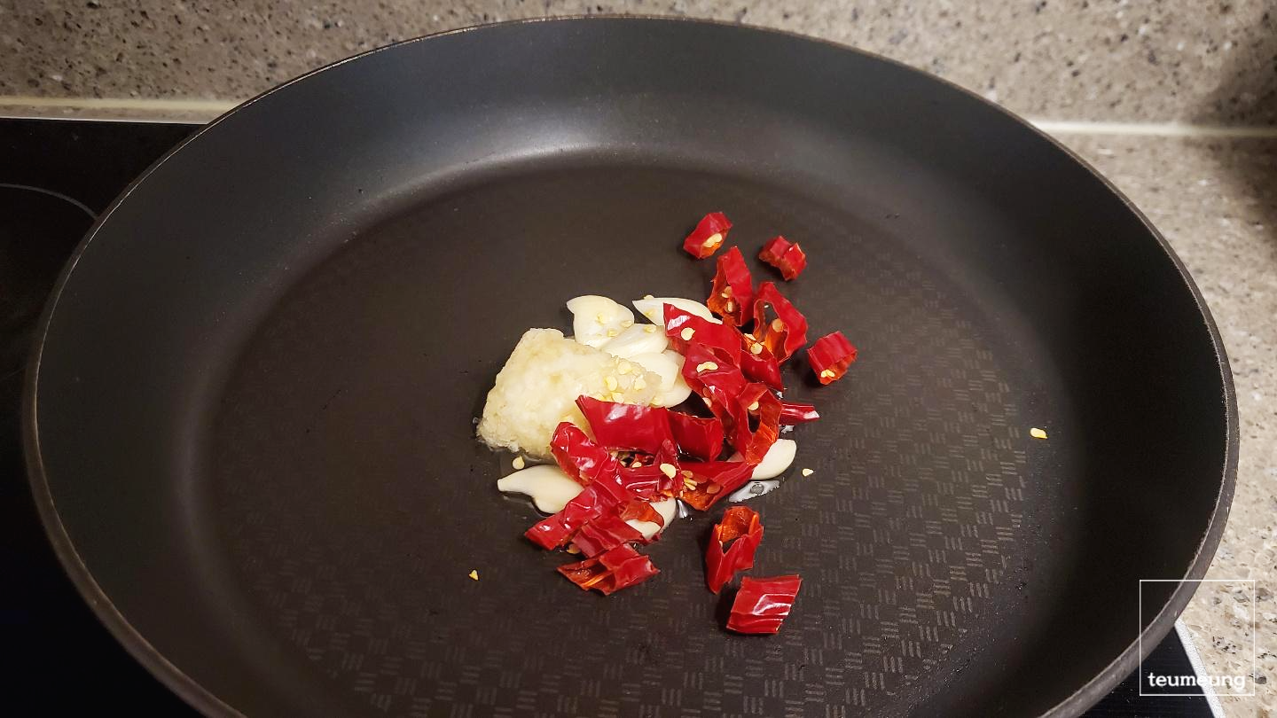 기름을 두르고 마늘과 고추를 먼저 볶아줍니다.