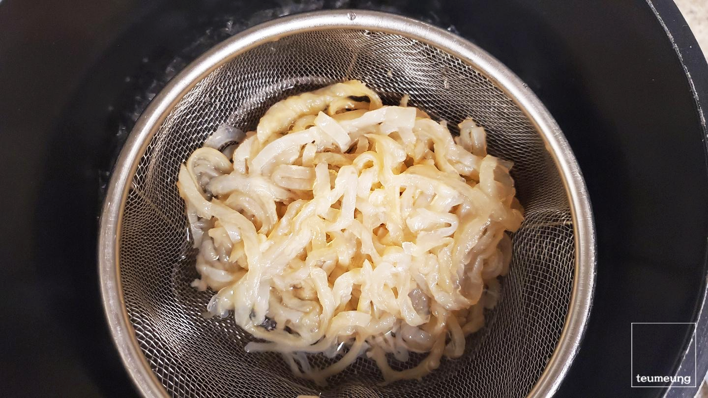 휘휘 저어서 빠르게 꺼낸 뒤 찬물로 헹궈줍니다