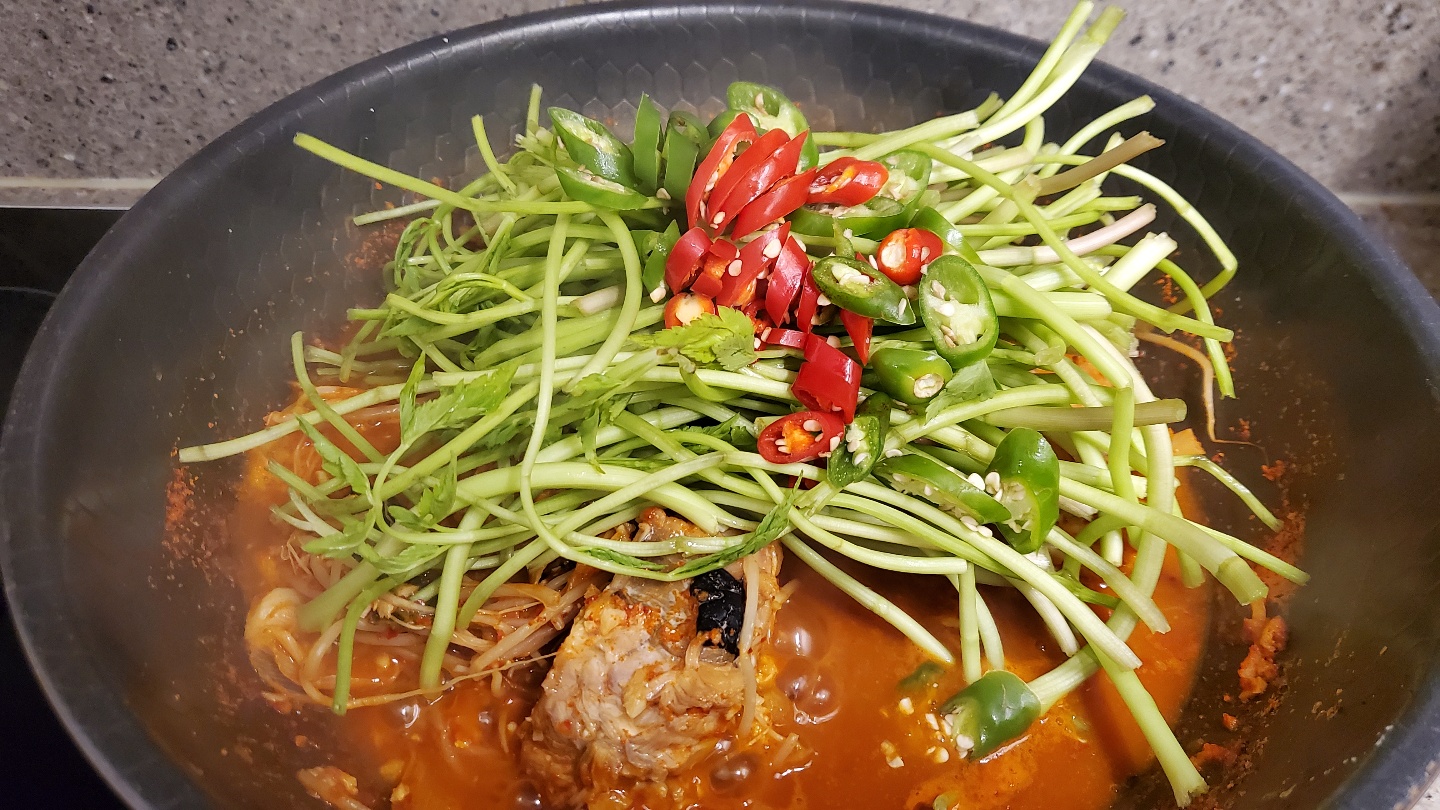 마지막에 미나리와 청양고추를 넣어주는데요~!