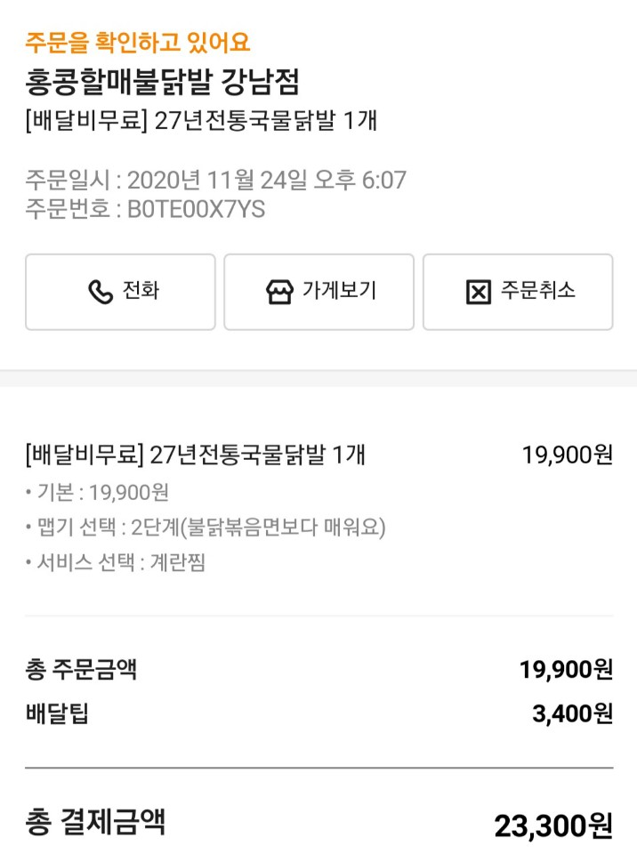 국물 닭발에 콩나물 얹어서 + 계란찜 (19,900) + 배달 팁 (3,400)