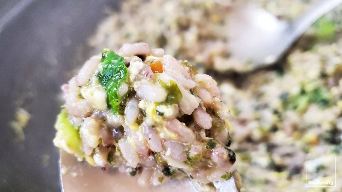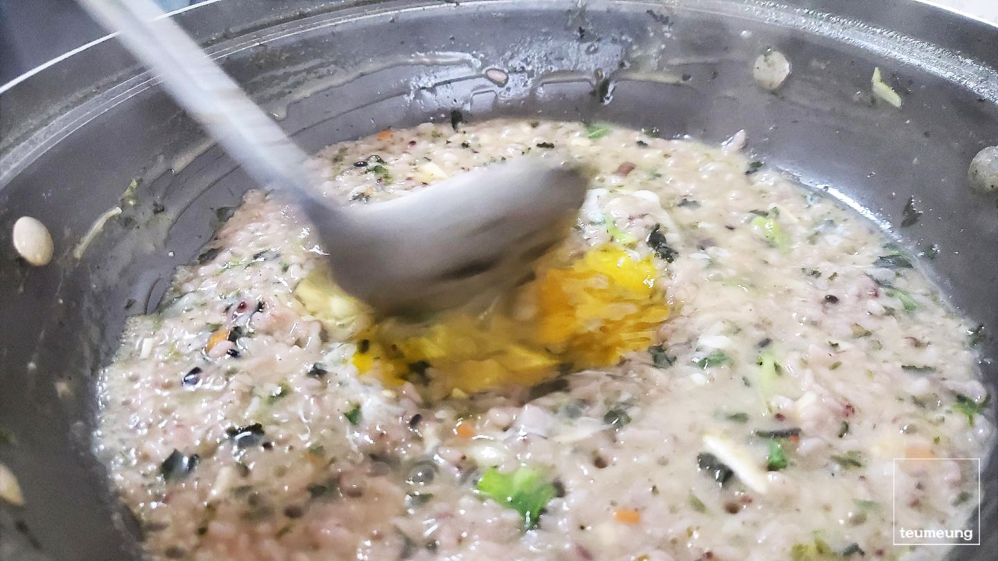 계란을 탁 넣고 볶으면 야채죽 완성!