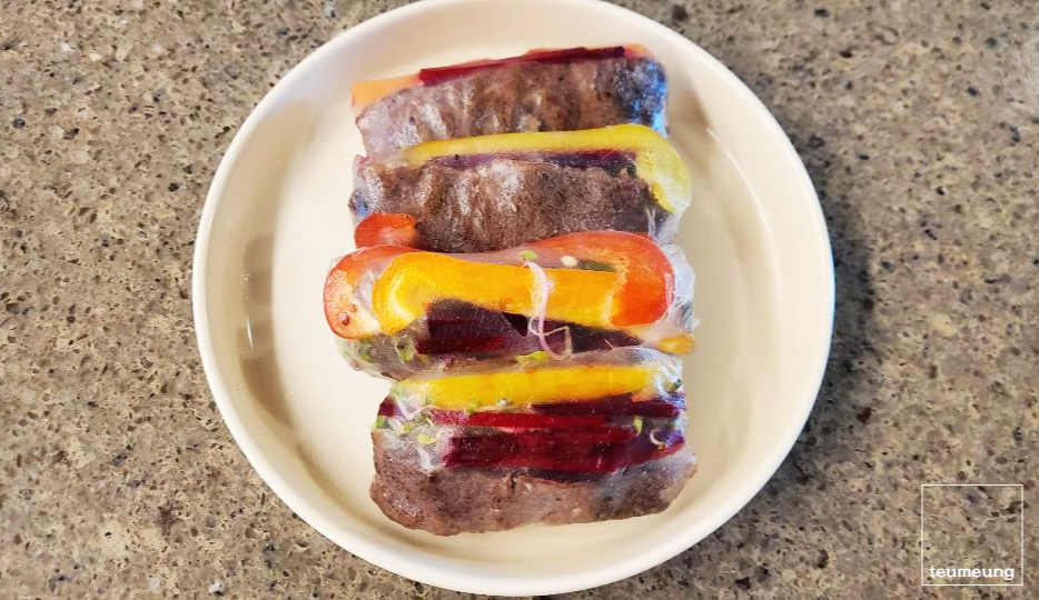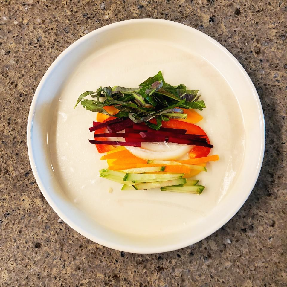 라이스 페이퍼를 뜨거운 물에 적셔서 올려주세요.
