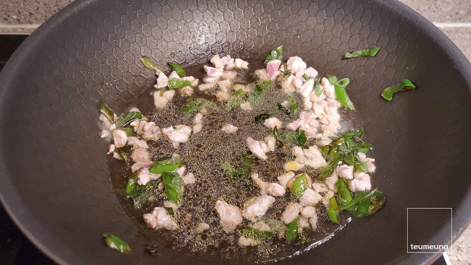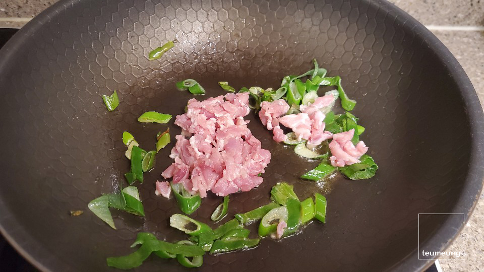 파 기름이 어느 정도 나오면 고기를 넣고 볶아주세요.