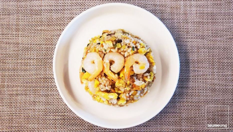 밥그릇에 새우를 차례로 이쁘게 깔고 그 위에 볶음밥을 올려서
