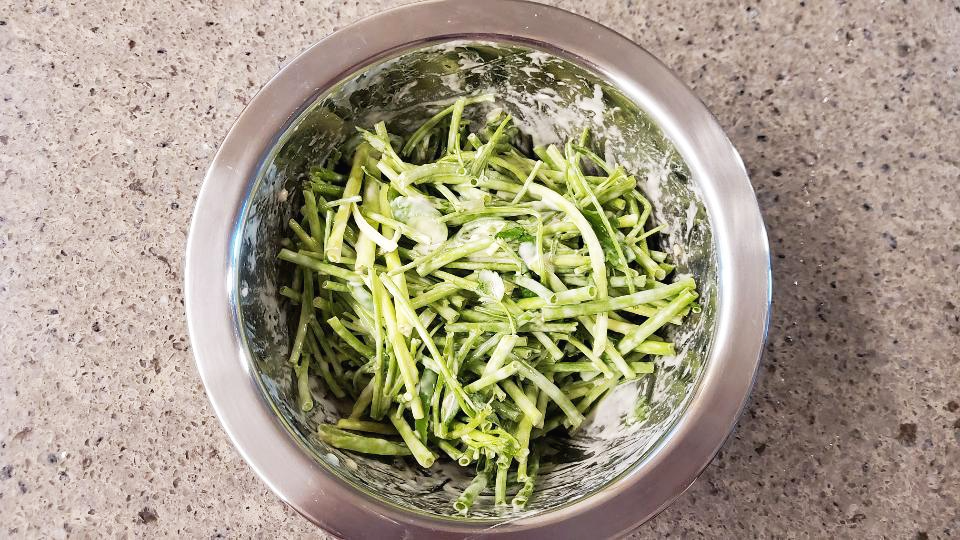 이제 미나리와 청양고추를 넣고 반죽이 뭉치지 않게 골고루 섞어줍니다.