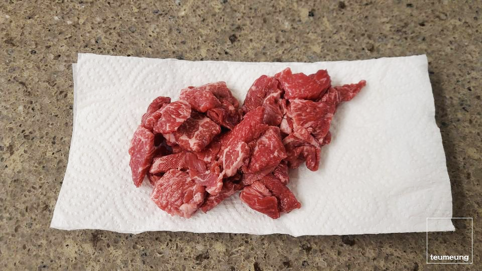 냉장되었던 고기는 키친타월로 핏물을 제거해주시면 됩니다.