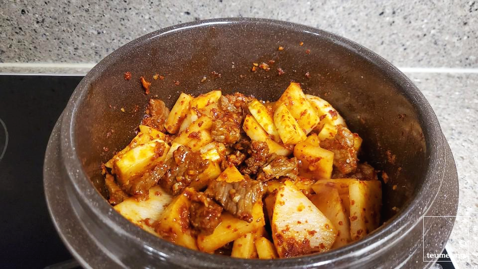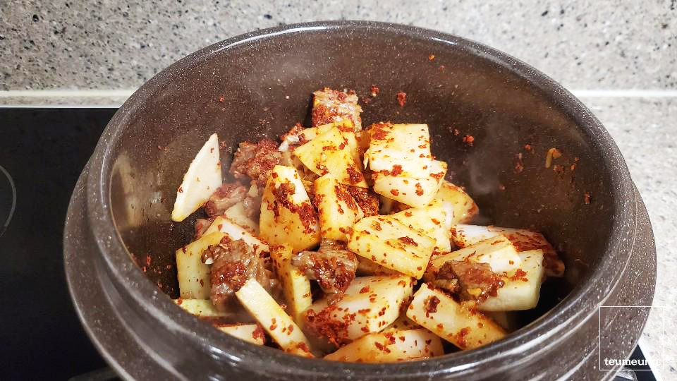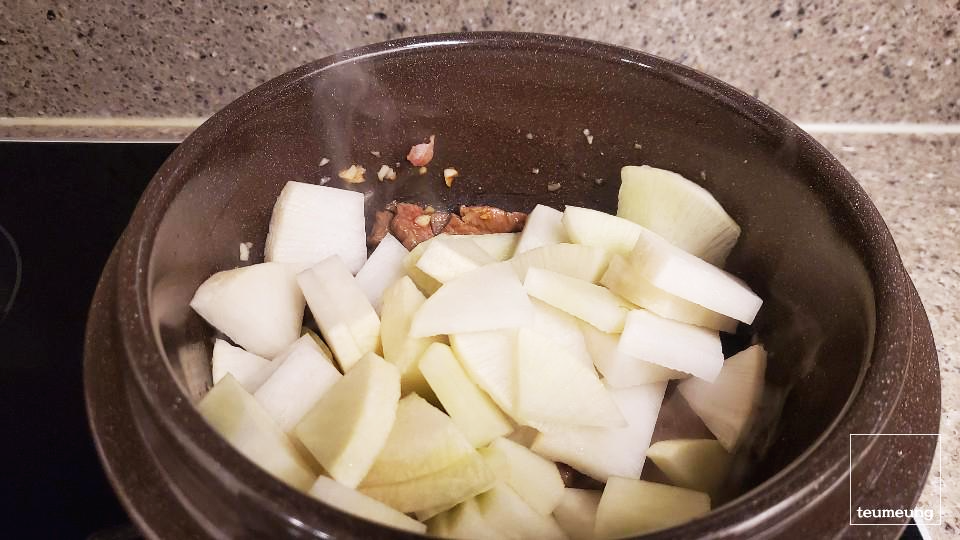 어느 정도 고기가 볶아졌으면 무를 넣고 한번 더 볶아줄게요.