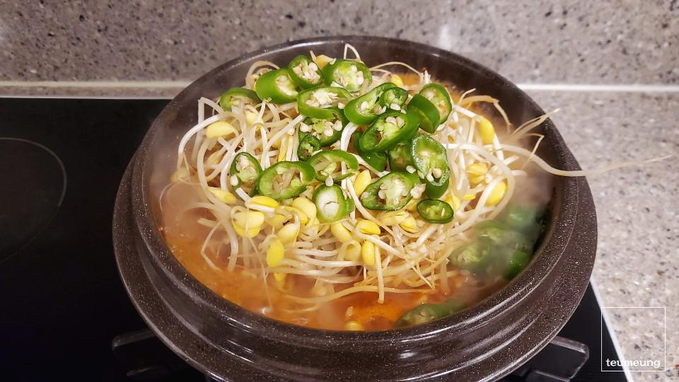 이제 콩나물이랑 청양고추를 한 번에 넣고
