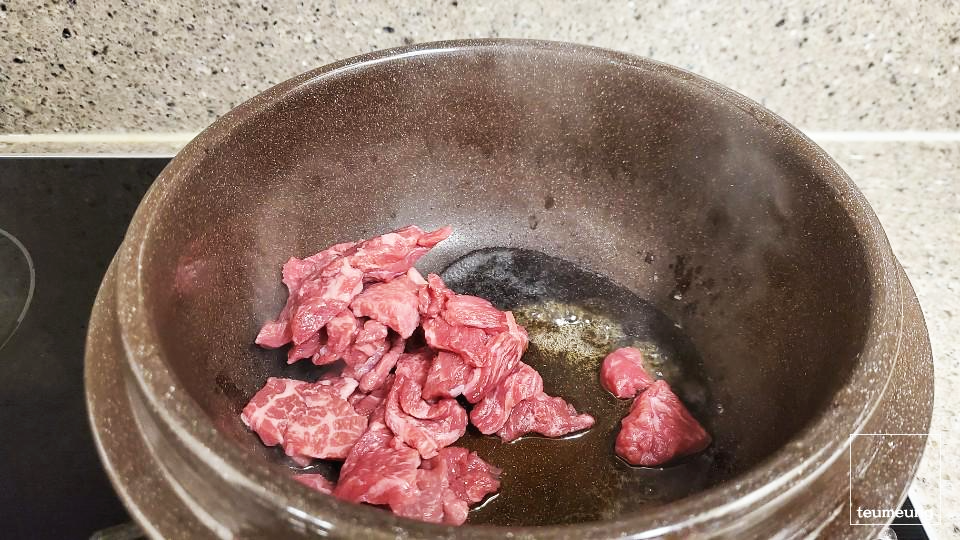 먼저 참기름을 두르고 소고기 먼저 볶아줄게요.