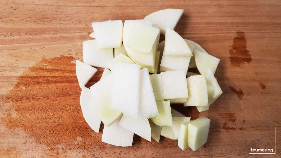 무는 너무 두껍지 않게 나박나박 썰어서 준비해 줍니다.